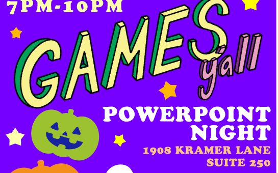 Games Y’all is a monthly meet up for the public and the Austin indie video game developer community. Each month a different selection of games being made by community are showcased and playable. Come hang out with local game developers and lovers of games and digital art. October’s Games Y’all will also include a variety of Power Point presentations by members of our community. This is always one of our most popular events so please RSVP at www.gamesyall.com.