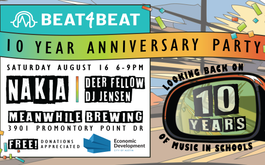 Meanwhile Brewing Co. 3901 Promontory Point Dr, Austin, TexasJoin us for a milestone celebration of Beat 4 Beat’s 10-Year Anniversary! This free, family-friendly event brings together Austin’s vibrant music community to honor a decade of empowering youth through music education. Enjoy live performances from local favorites Nakia, Deer Fellow, and DJ Jensen, with special guest appearances and surprises. Past and current students will […]